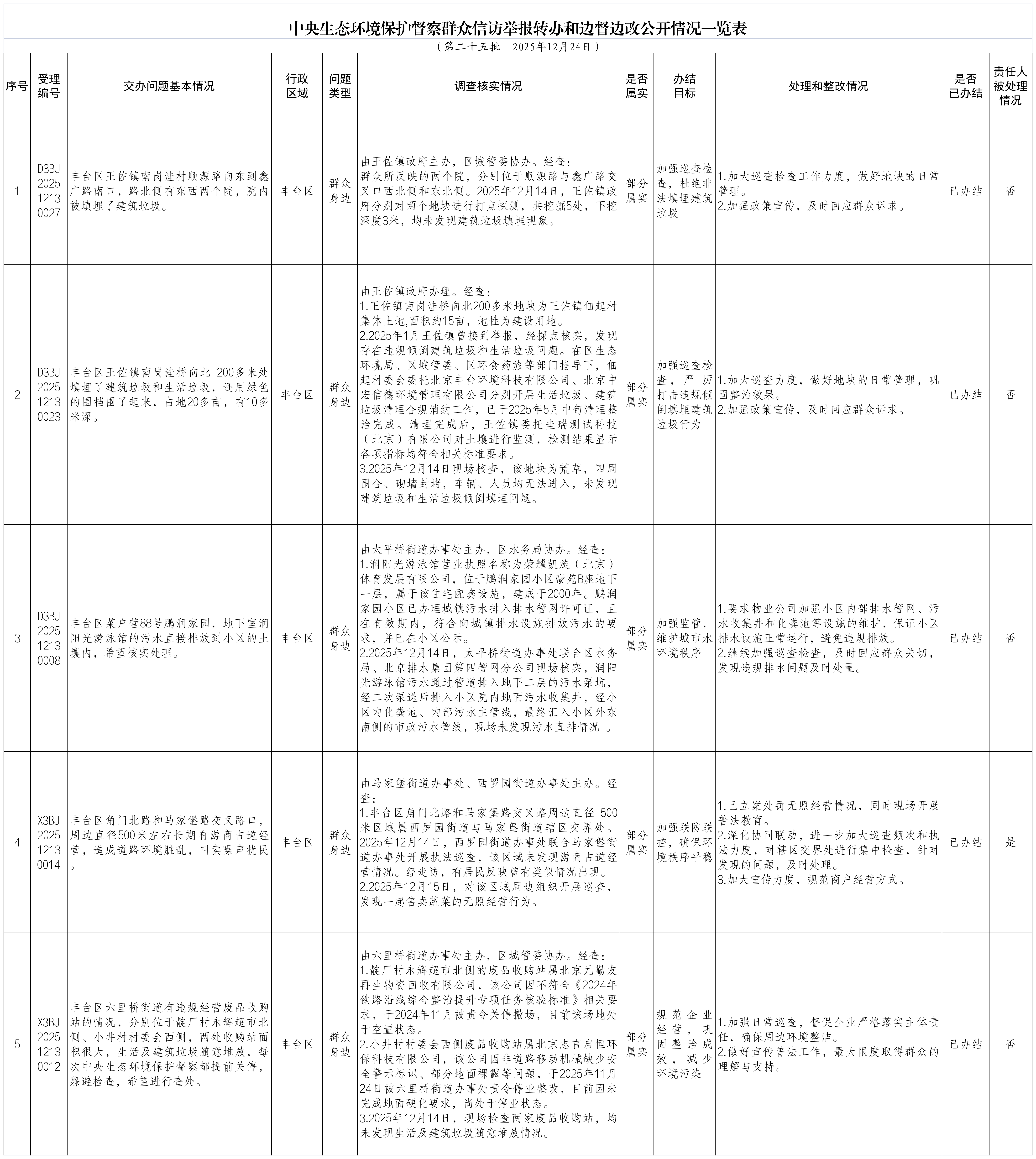 2025年12月14日,中央第一生态环境保护督察组向北京市交办第二十五批群众信访举报件30件,涉及欧博(中国)官方网站 5件。现按要求向社会公开本区该批次《中央生态环境保护督察群众信访举报转办和边督边改公开情况一览表》(见下表)。