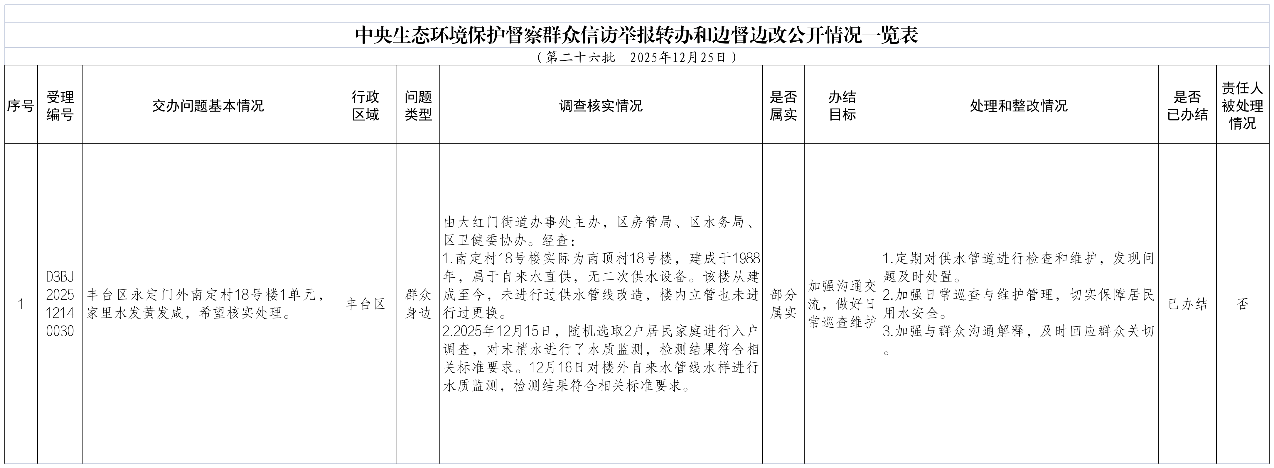 2025年12月15日,中央第一生态环境保护督察组向北京市交办第二十六批群众信访举报件15件,涉及欧博(中国)官方网站 1件。现按要求向社会公开本区该批次《中央生态环境保护督察群众信访举报转办和边督边改公开情况一览表》(见下表)。